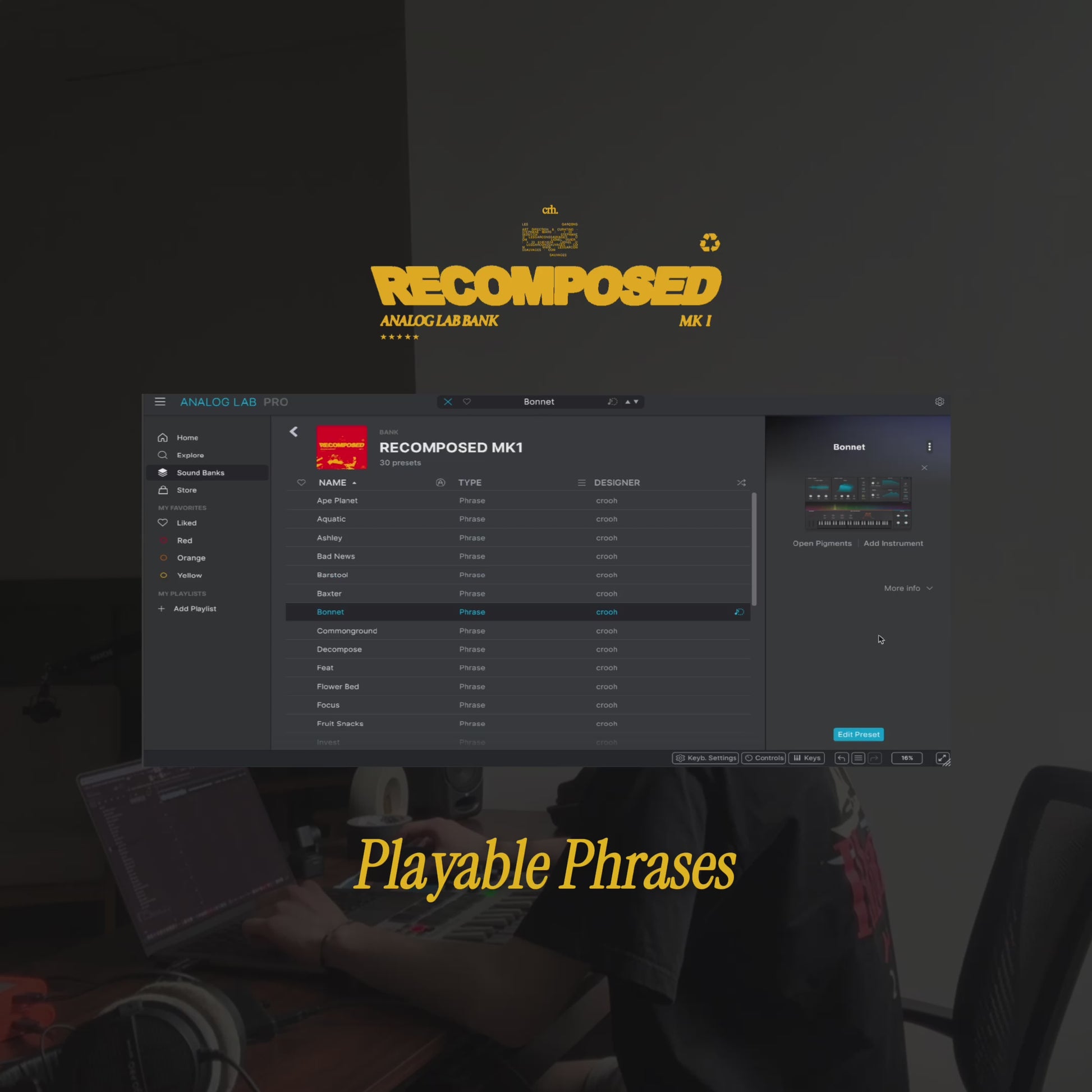 “Recomposed”, a concept where past stems and ideas were repurposed and combined to make playable phrases within Analog Lab, intended to help get your ideas off the ground quickly or to be added to existing projects.